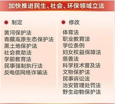 制定黃河保護法、青藏高原生態(tài)保護法、黑土地保護法、社會救助法、學前教育法、民事強制執(zhí)行法、反電信網(wǎng)絡詐騙法,修改體育法、職業(yè)教育法、學位條例、婦女權益保障法、慈善法、科學技術普及法、文物保護法、民事訴訟法、治安管理處罰法、野生動物保護法。